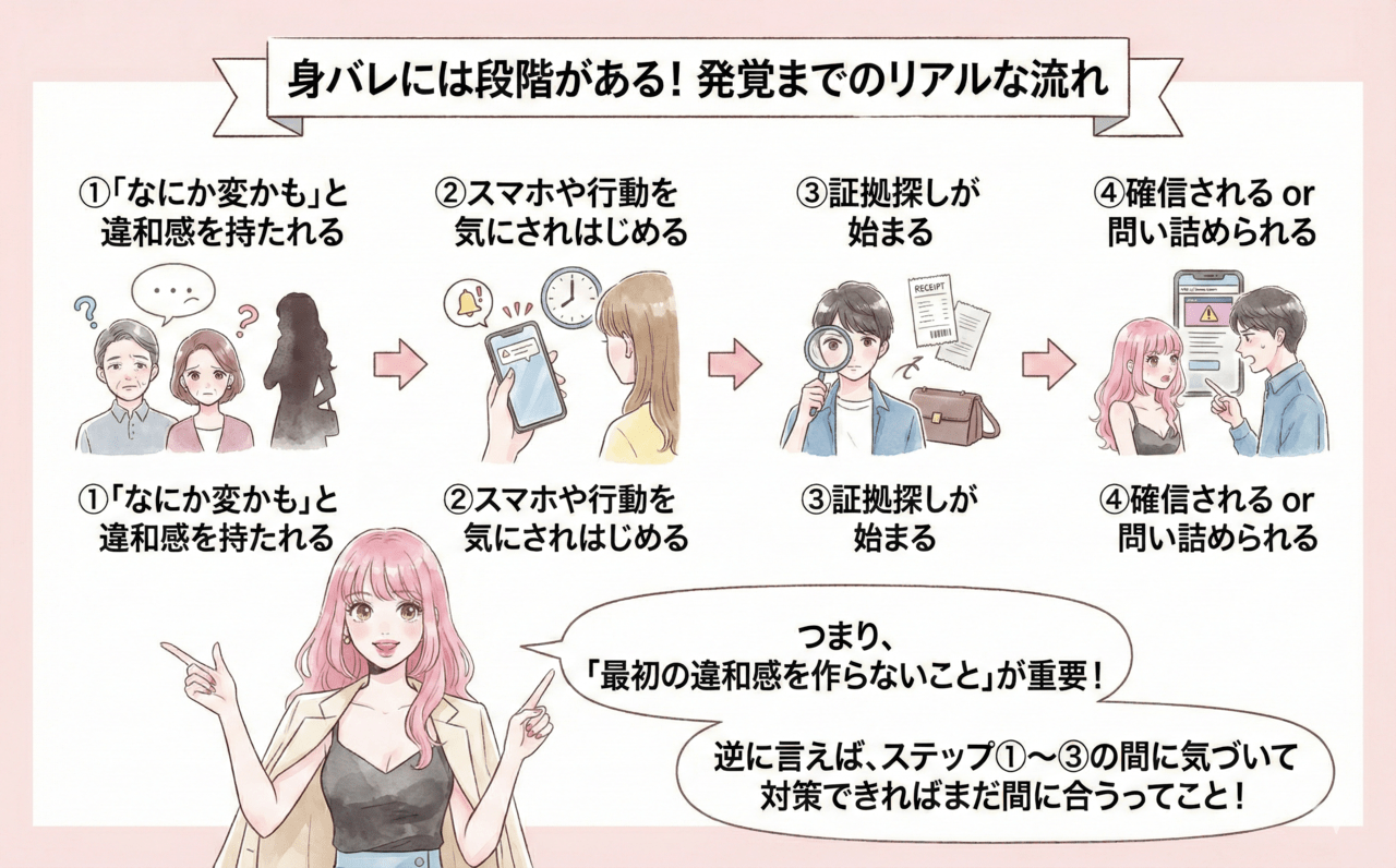- 身バレは「急に起きる」のではなく段階的に発覚することが多い
