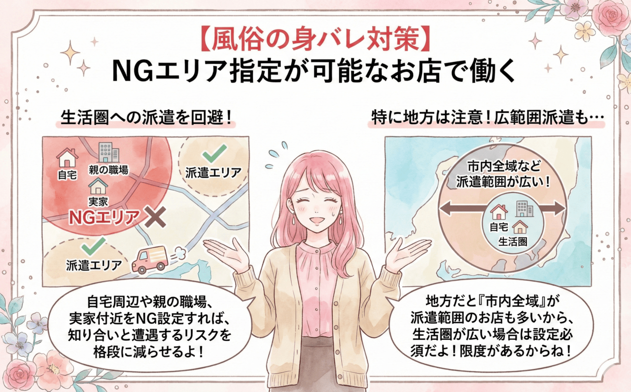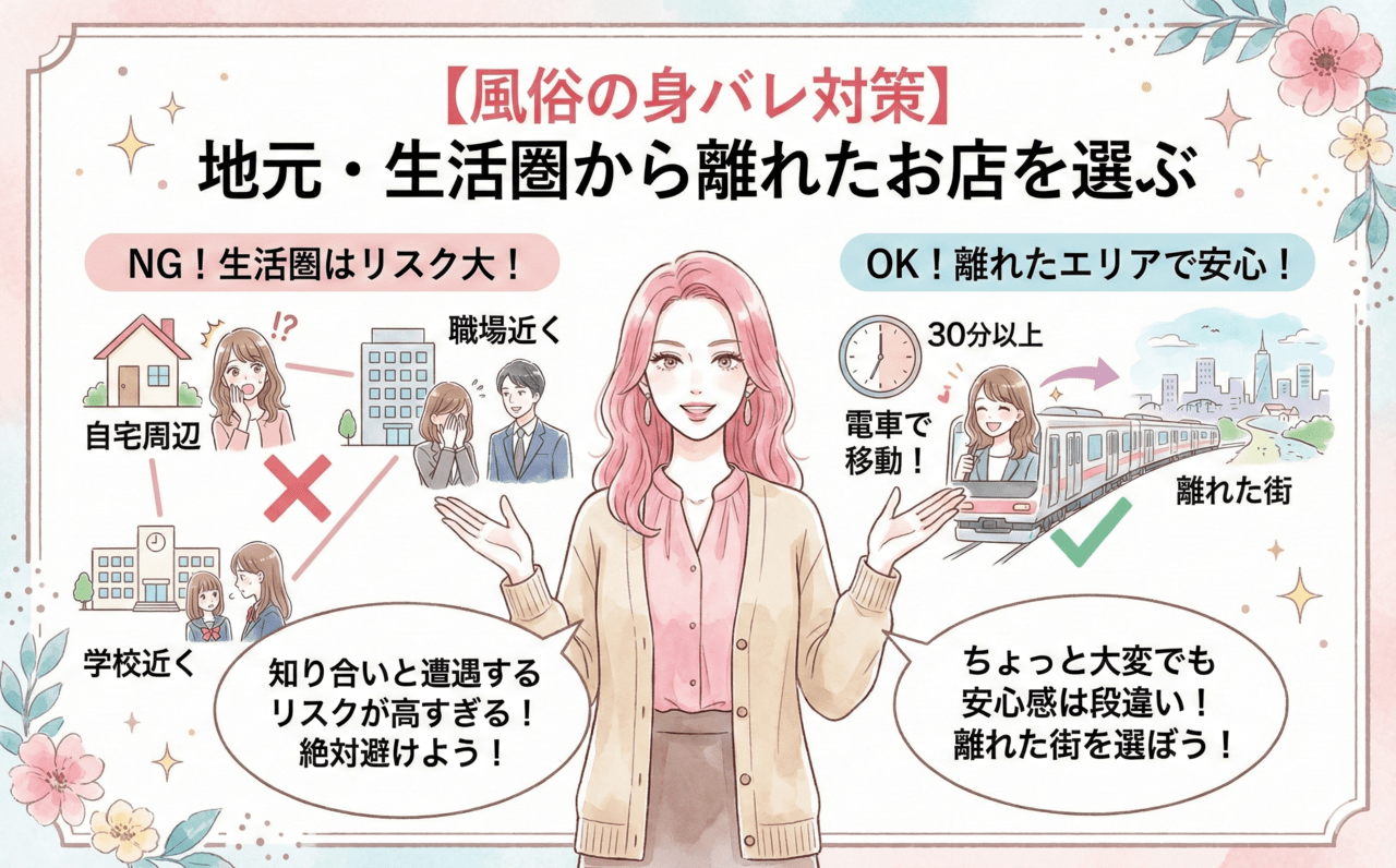 接客前にお客さんの顔を確認できる店舗型のお店を選んだり、生活圏を避けたエリアで働く方法もあります。
